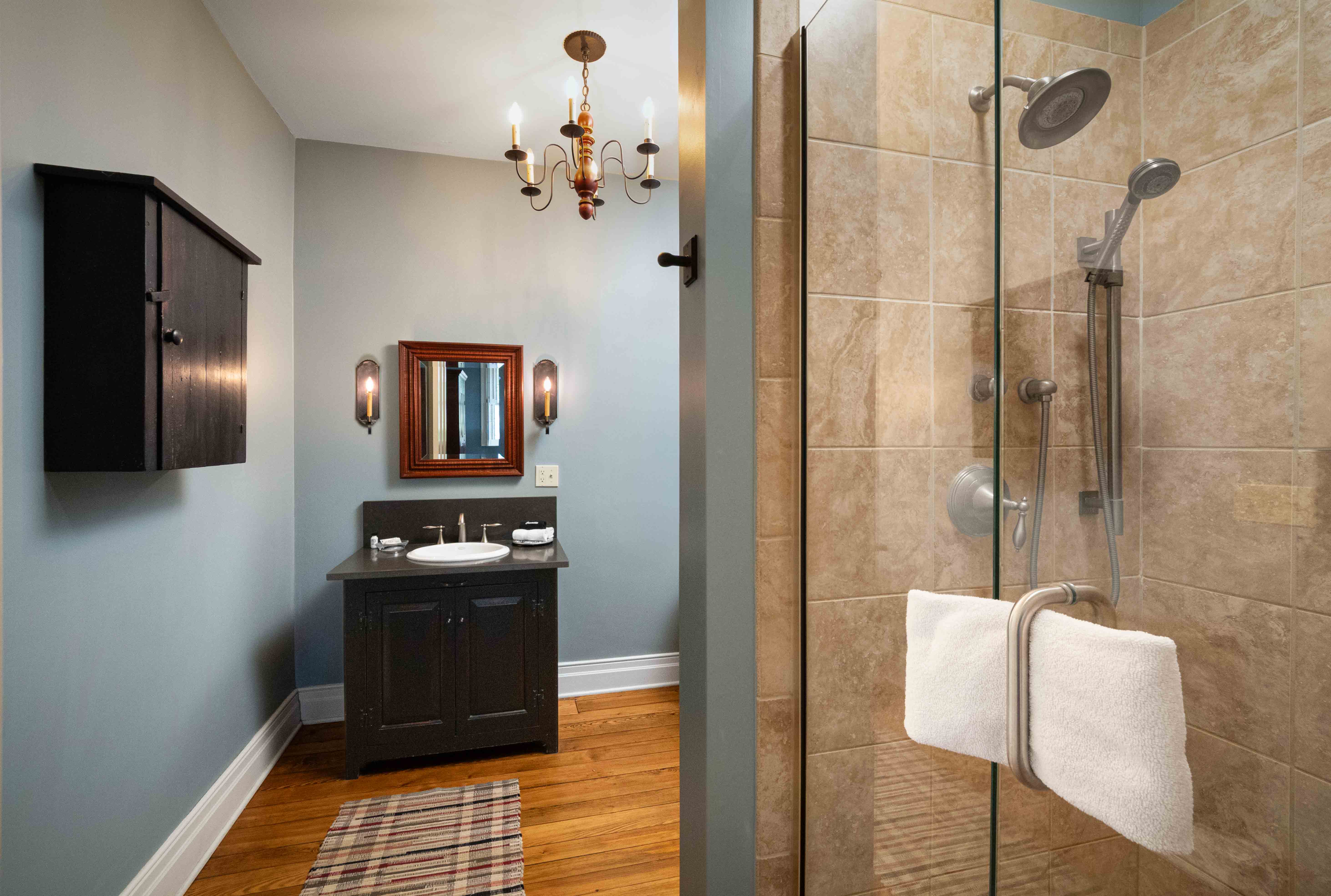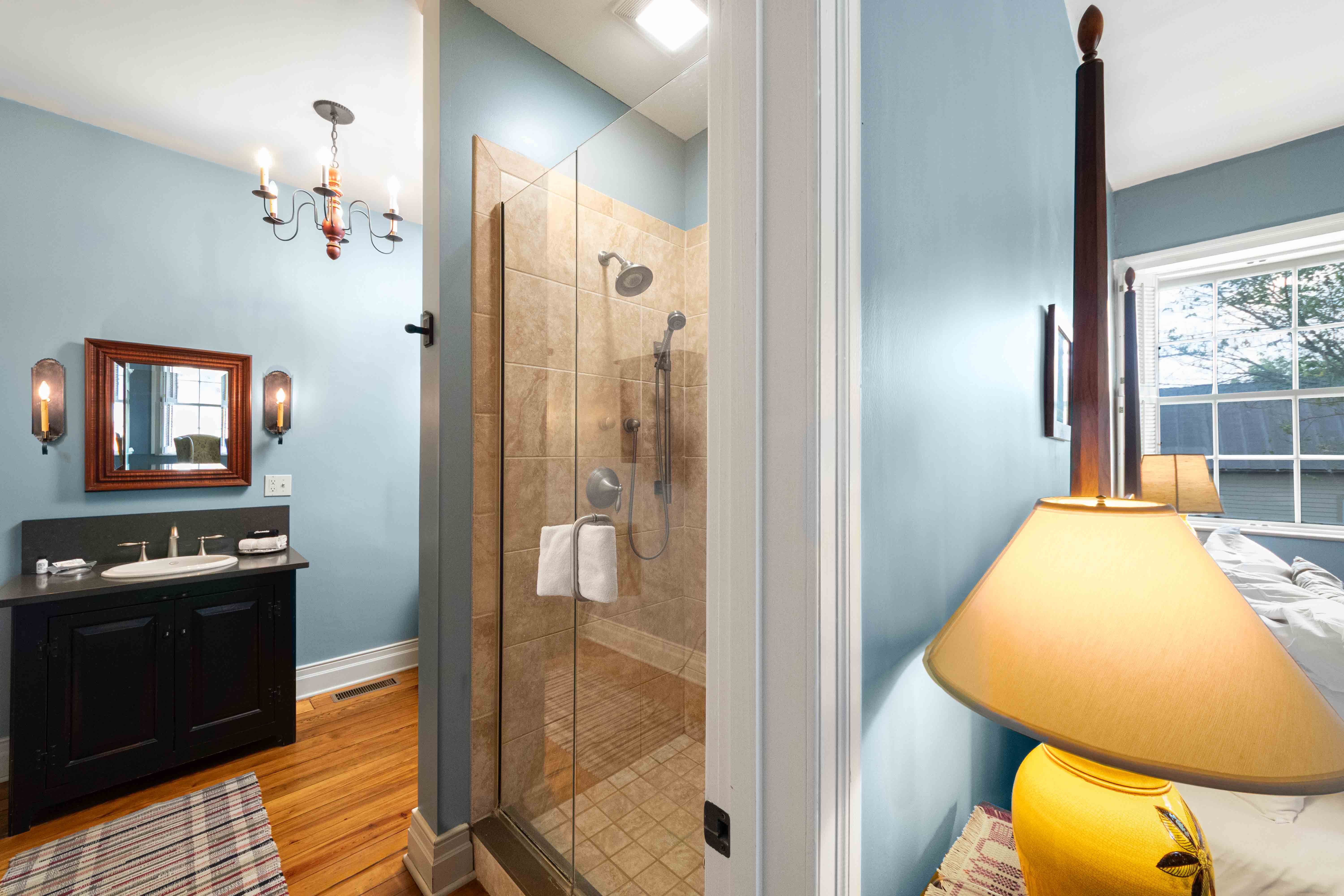 The Gustave Room is on the main level of the Weinert Haus and has a king-size bed and in en-suite bathroom with a walk-in shower.