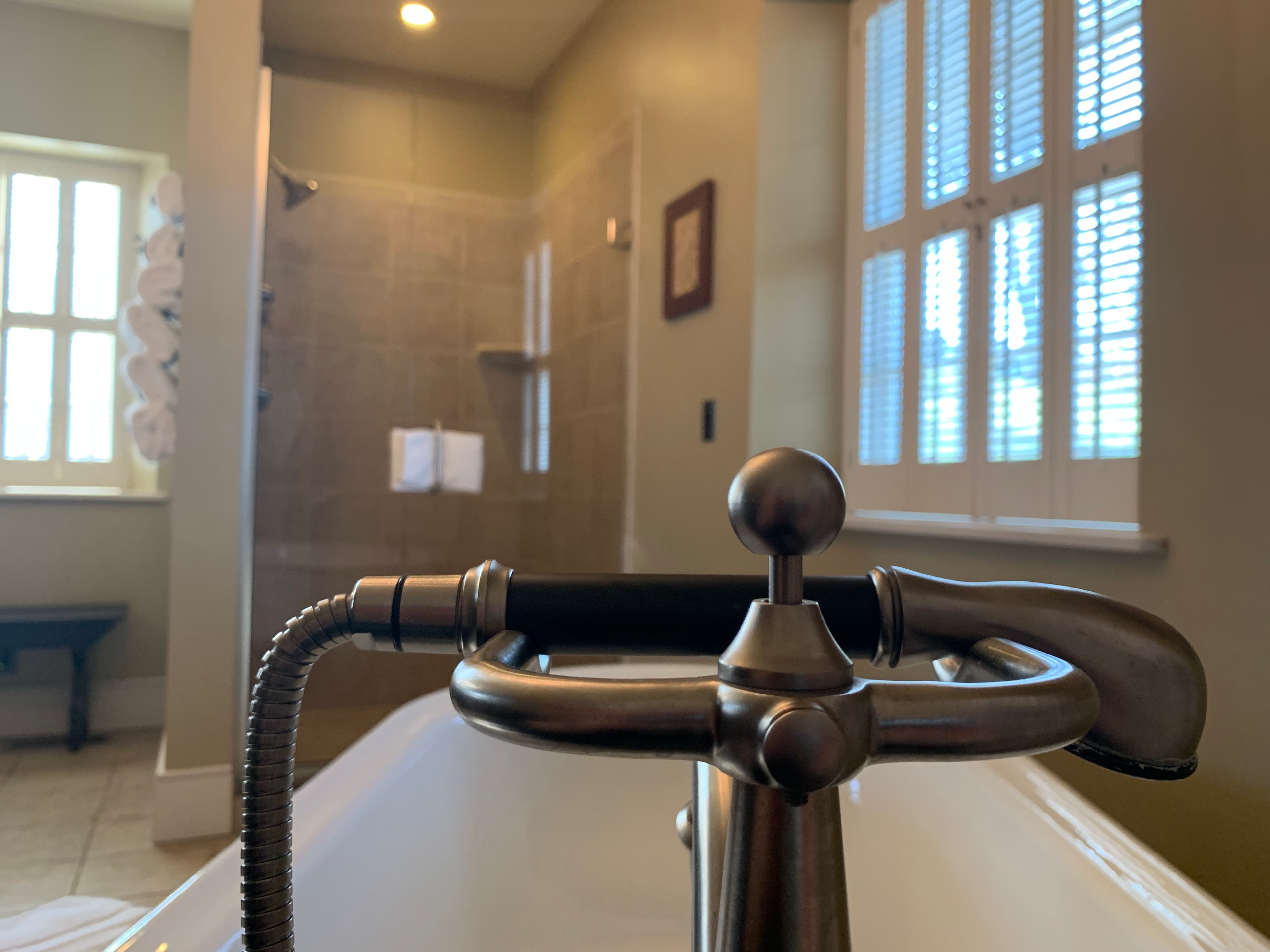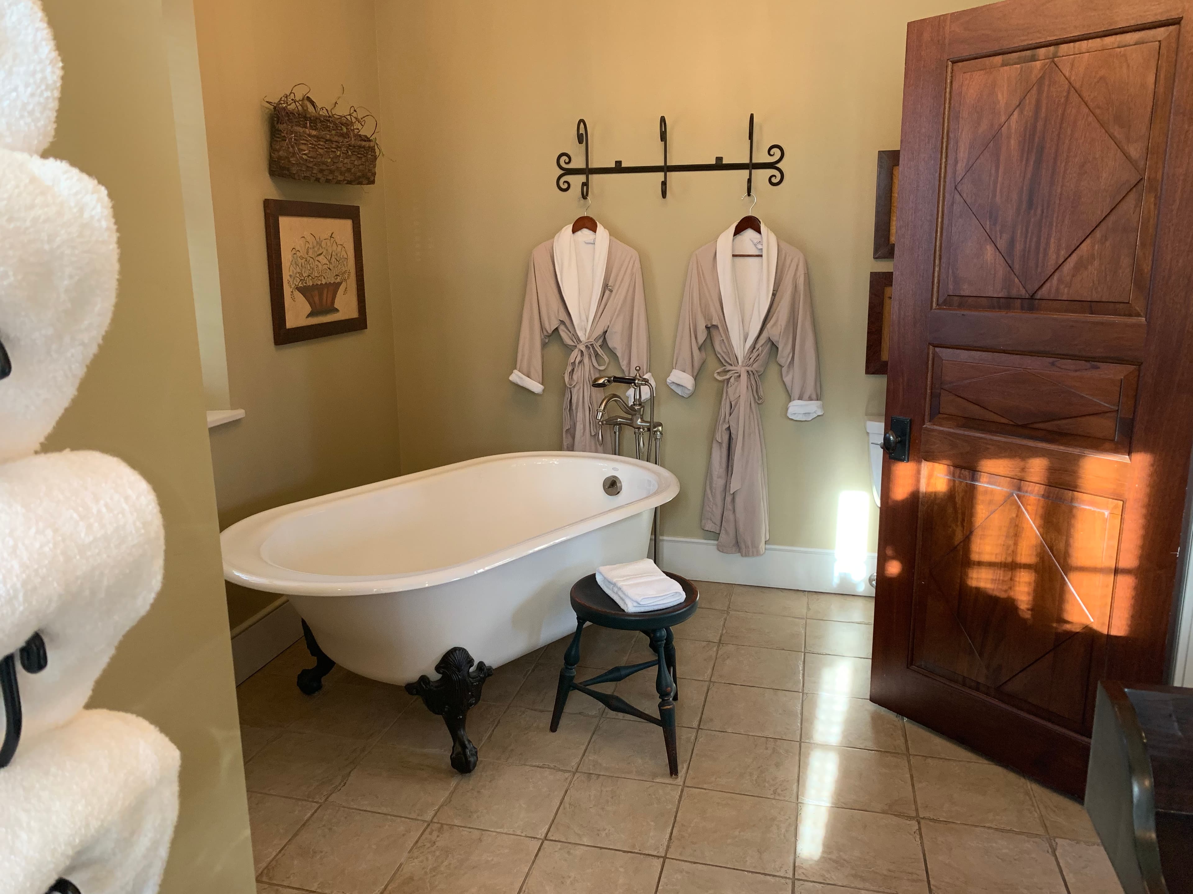 The Mozart room is on the main level of the Berger Grass Haus. With views of the hillside and Missouri River, this room features a king bed, walk-in shower, and a claw-foot tub.