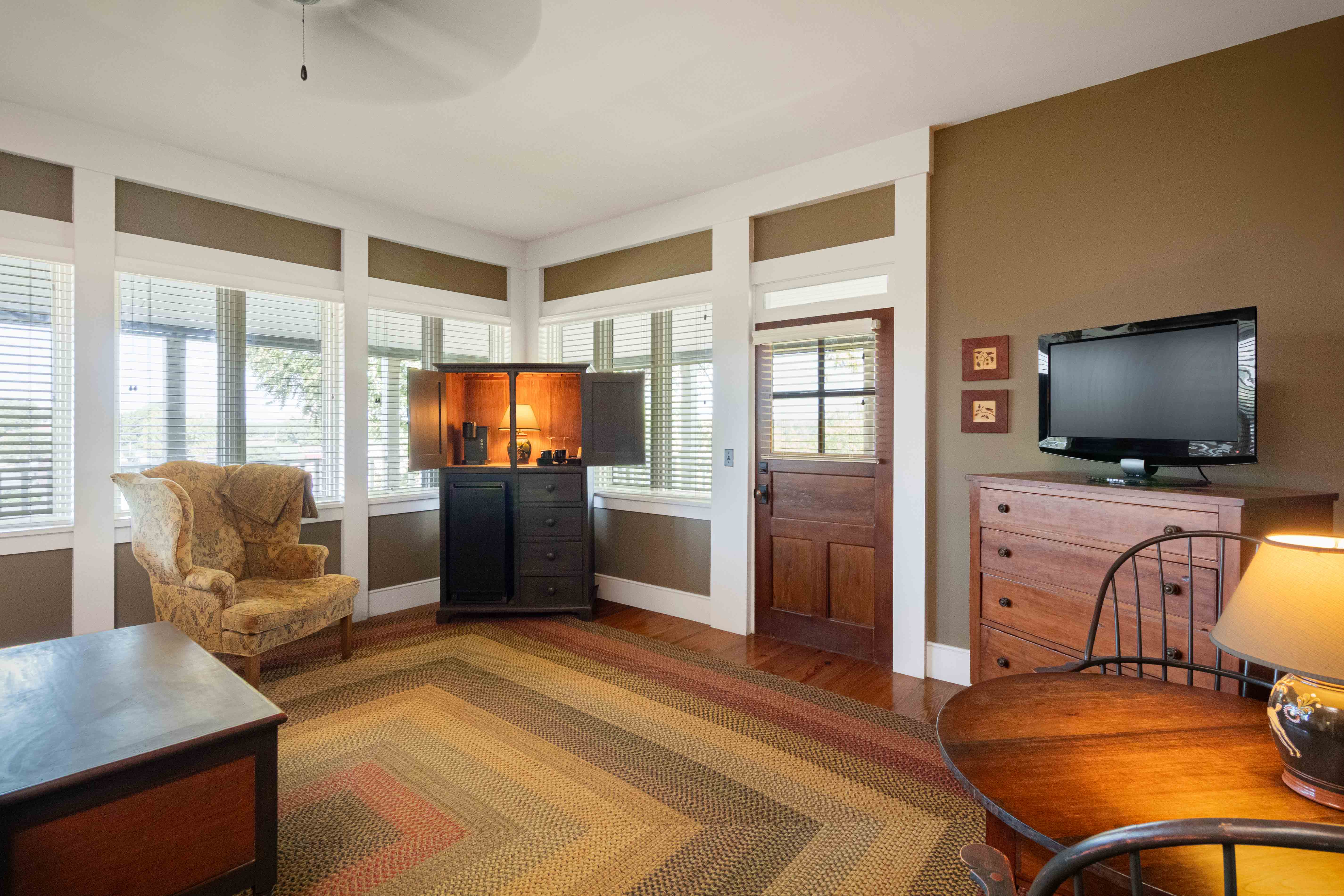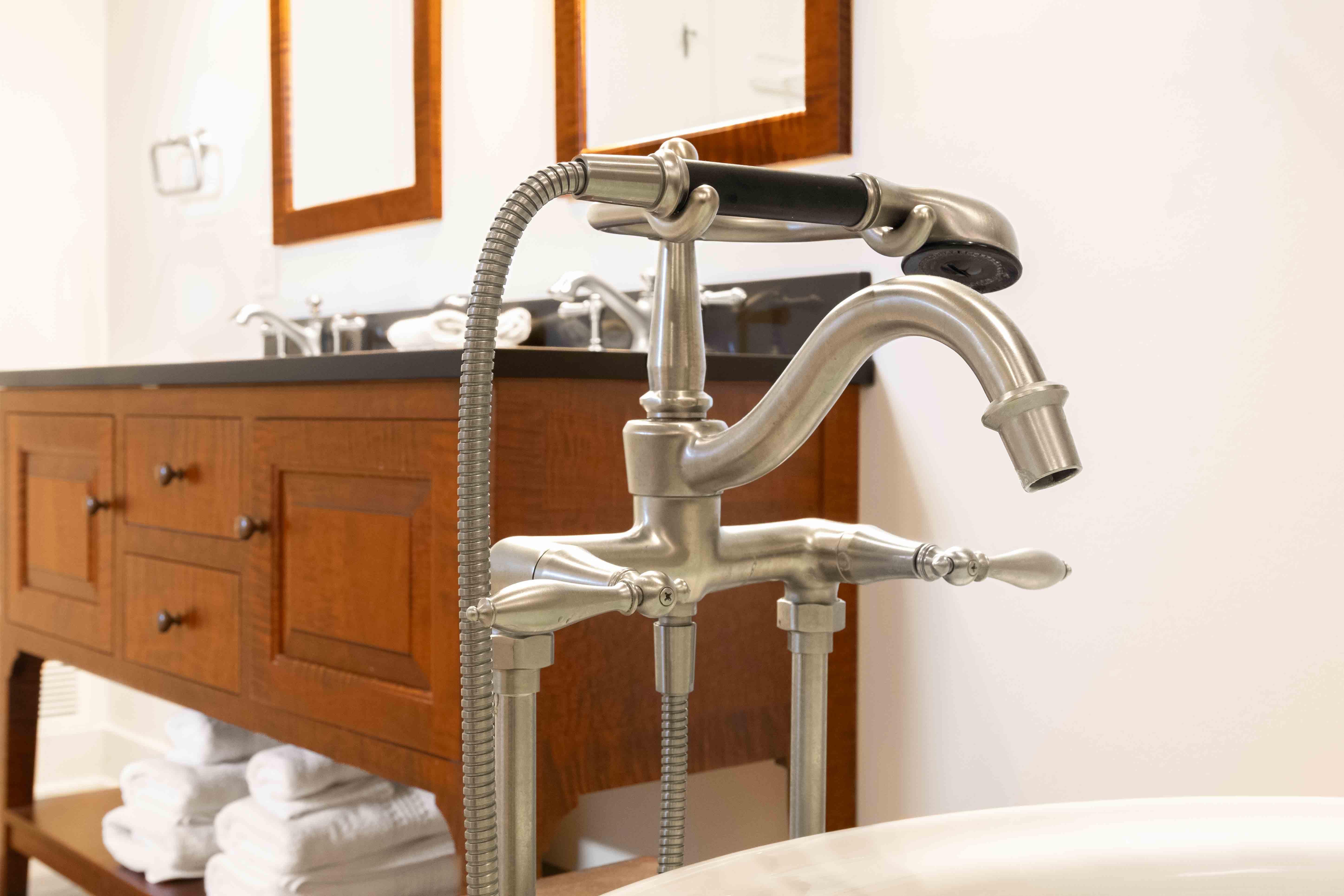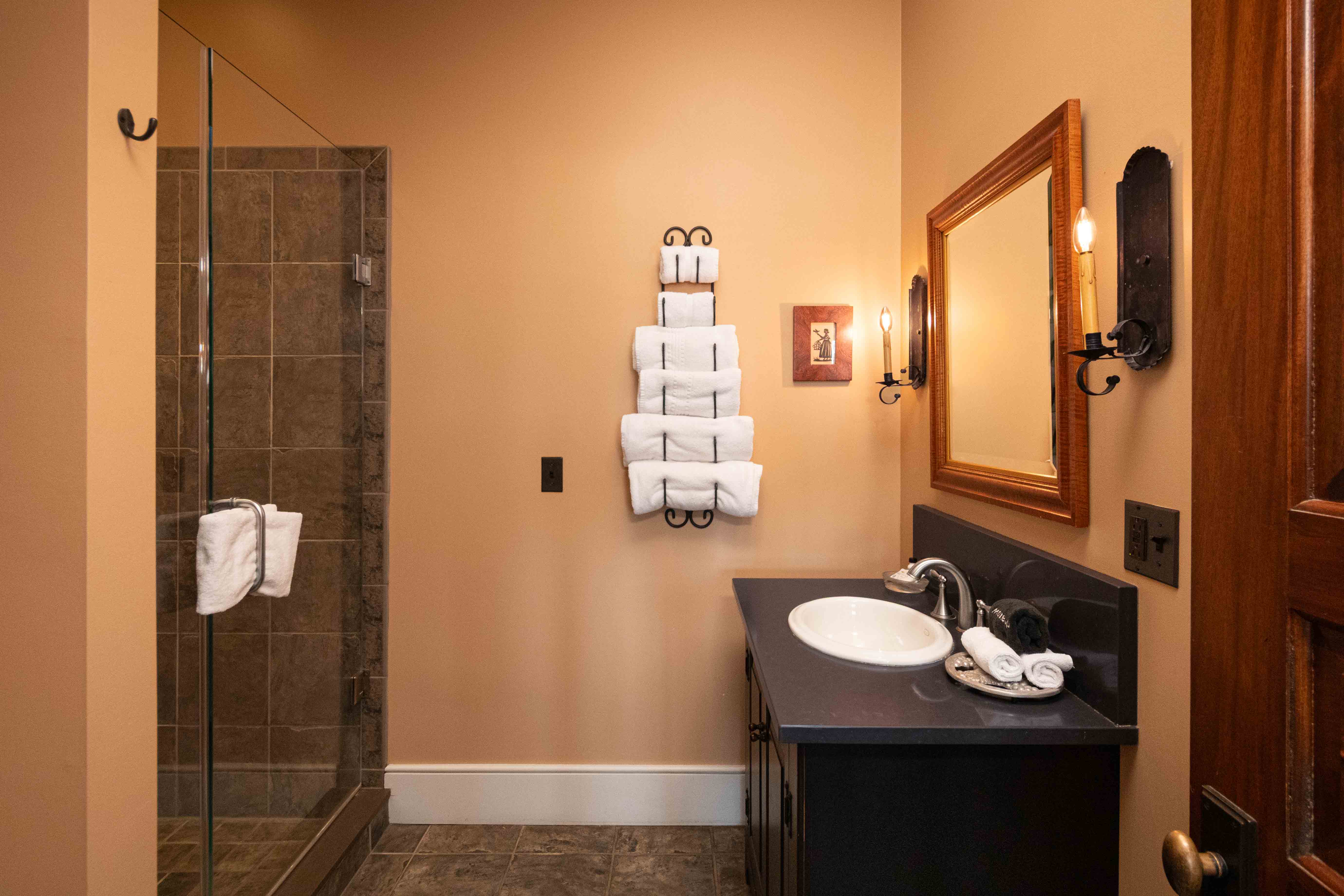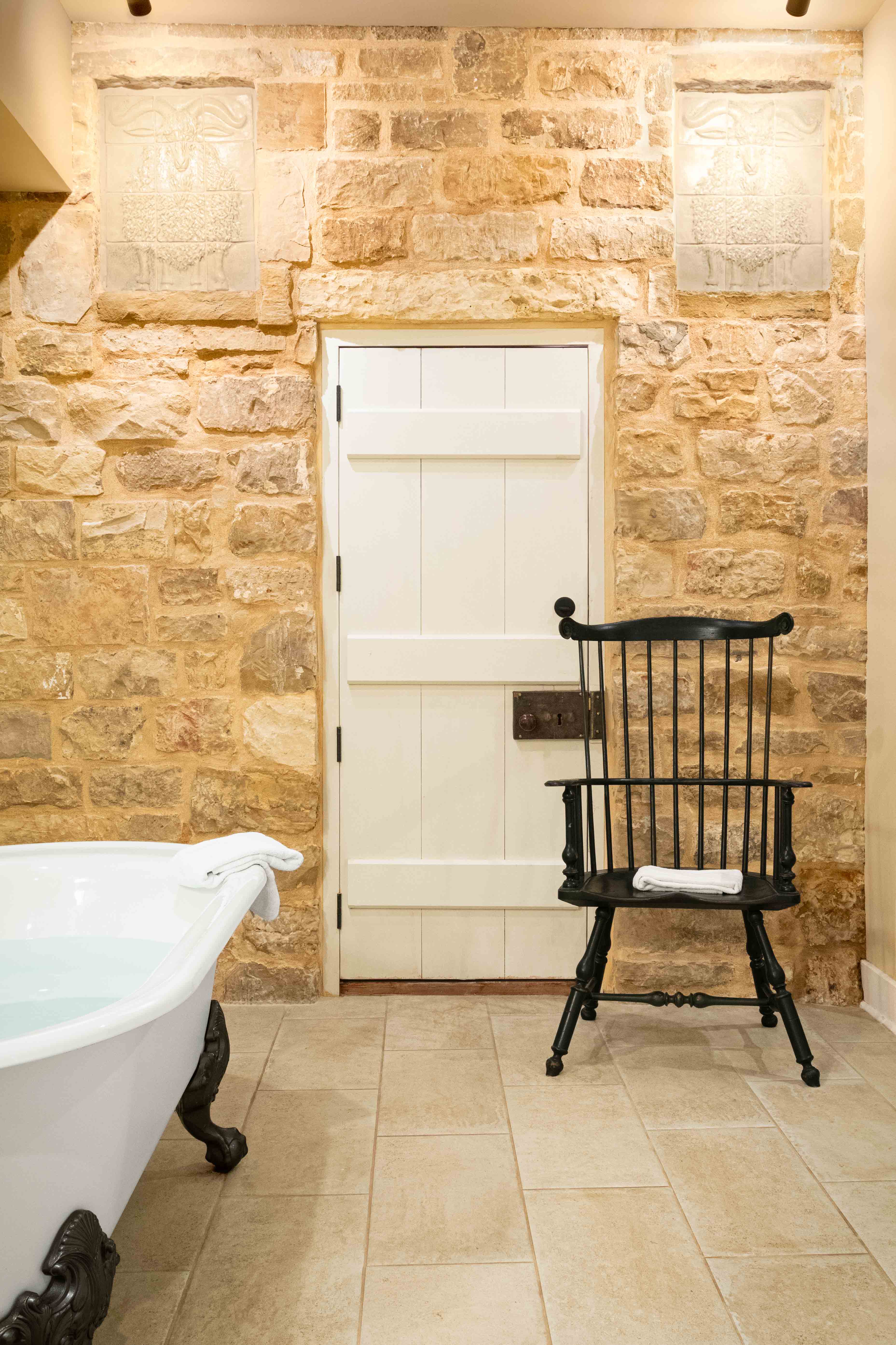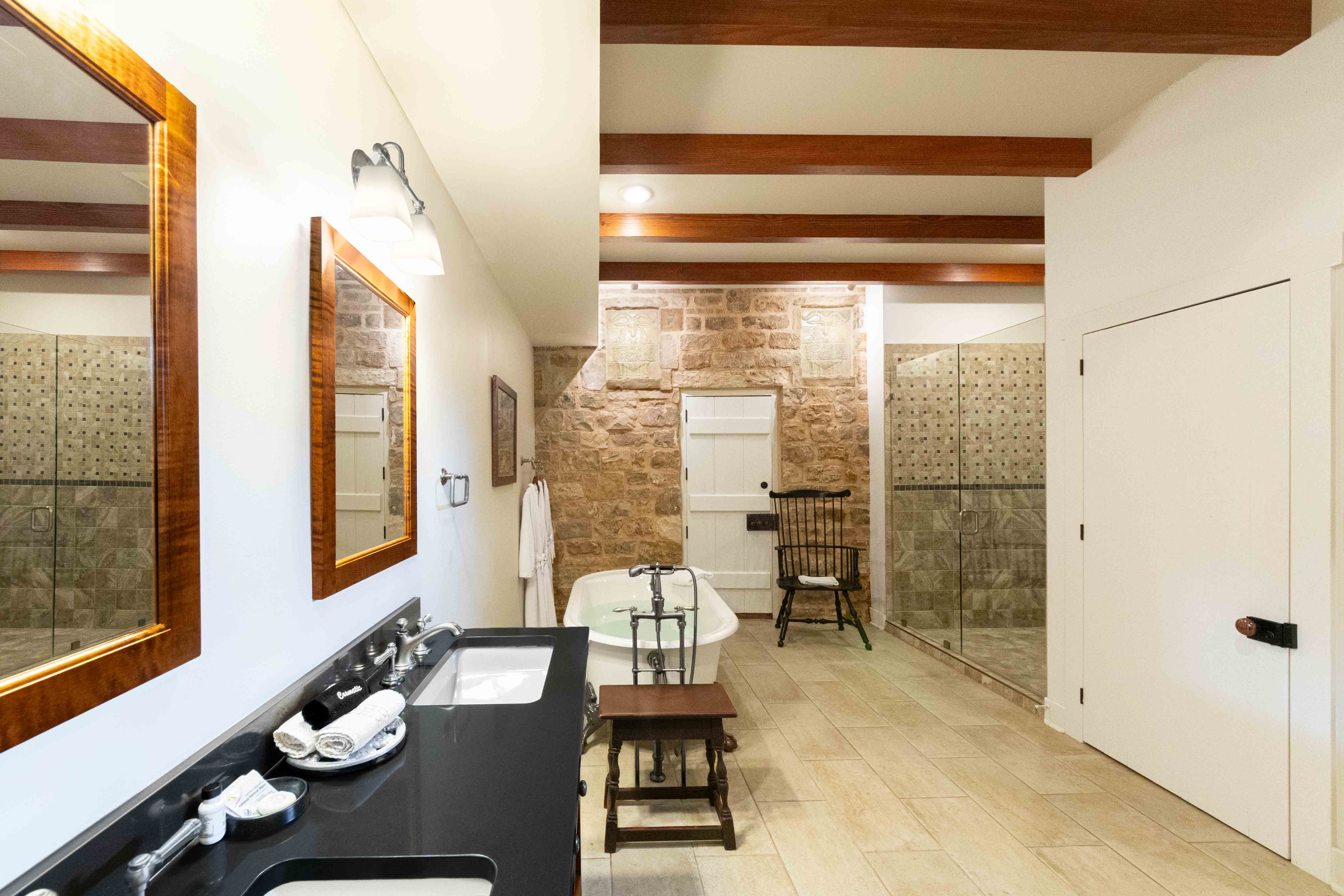 This cottage is on a hillside with both levels having exterior entrances. The upper level is the bedroom, with a sitting area and windows looking out over the town of Hermann. The lower level is the bathroom, with a oversized walk-in shower, soaking tub, double vanity, and incredible stonework.