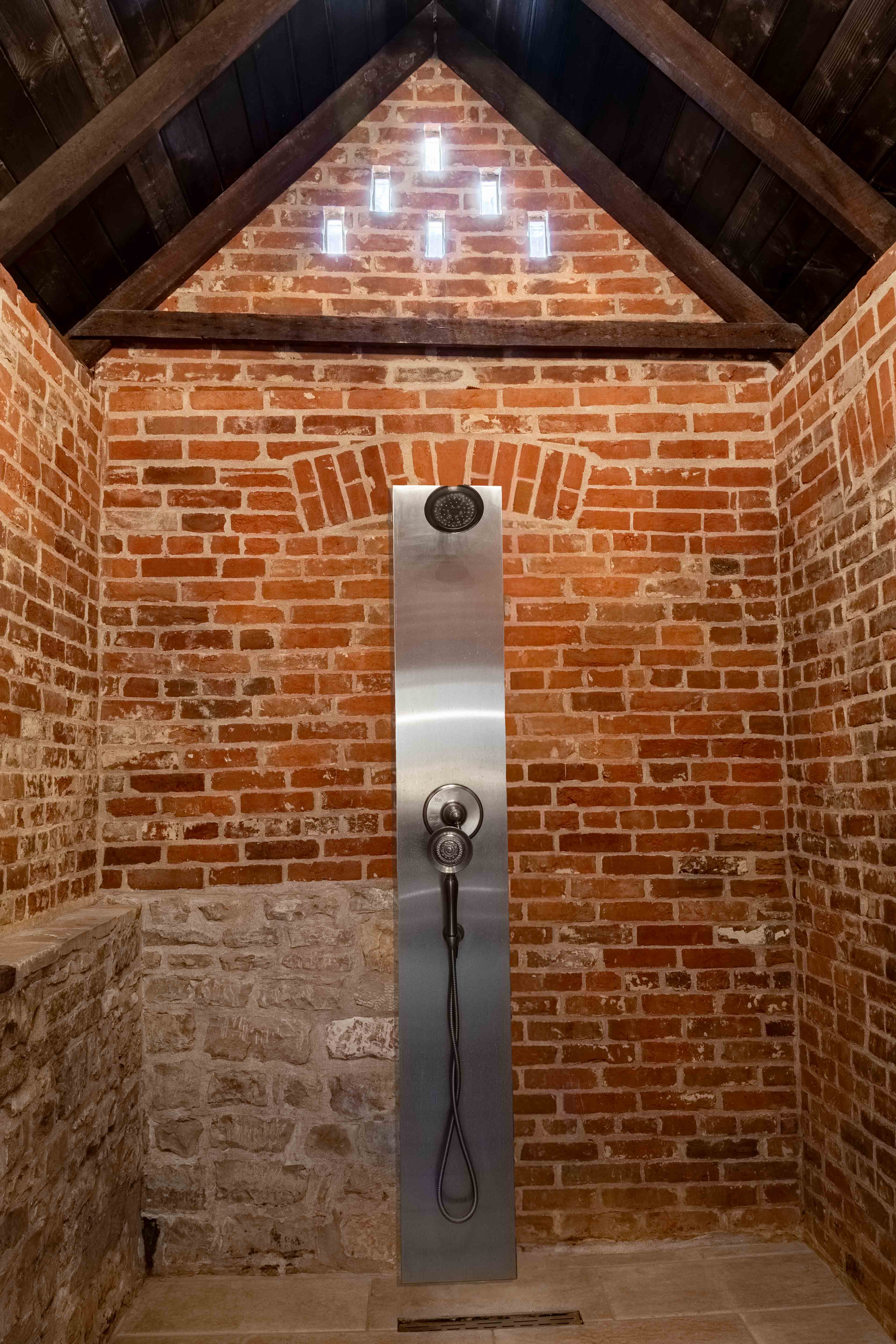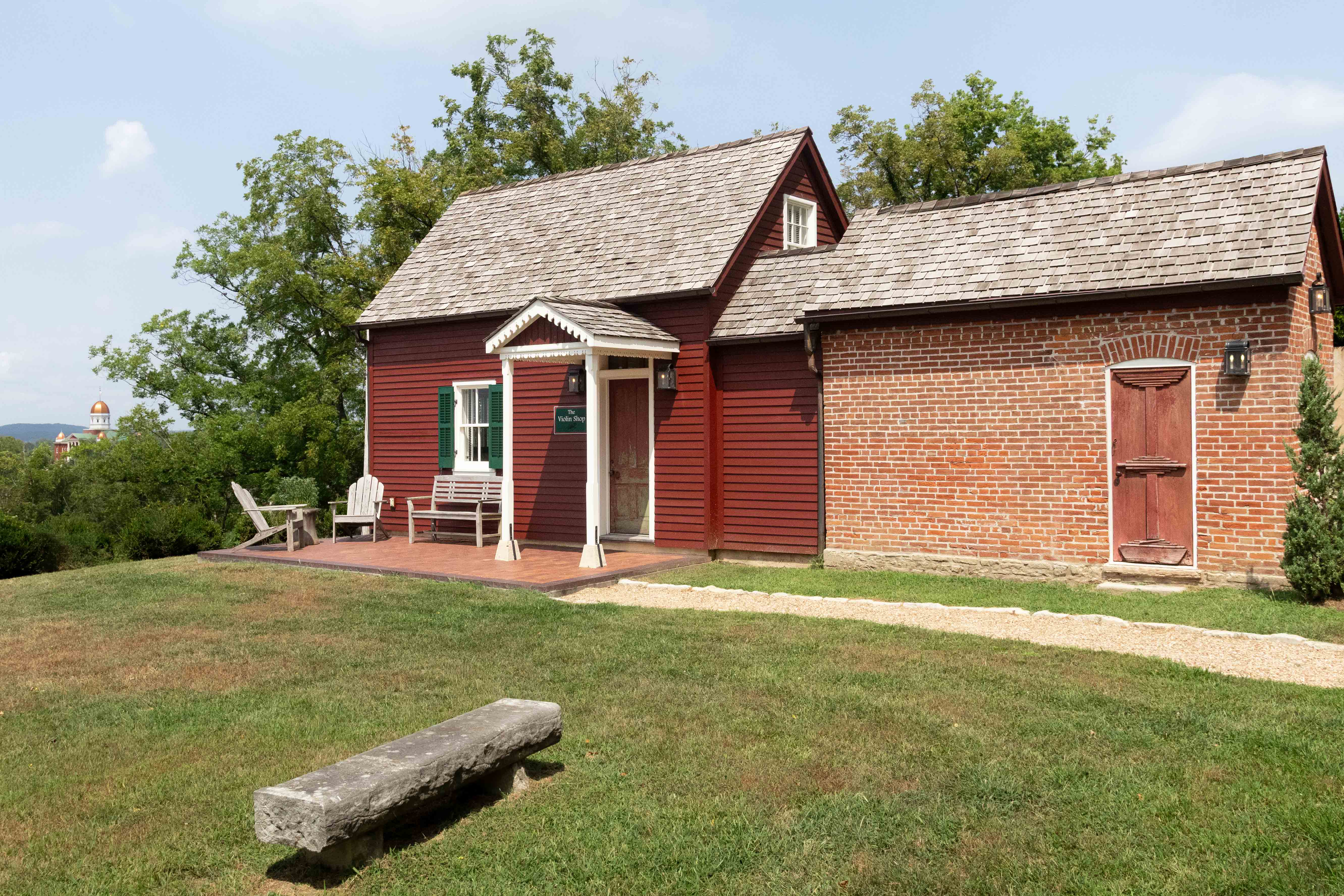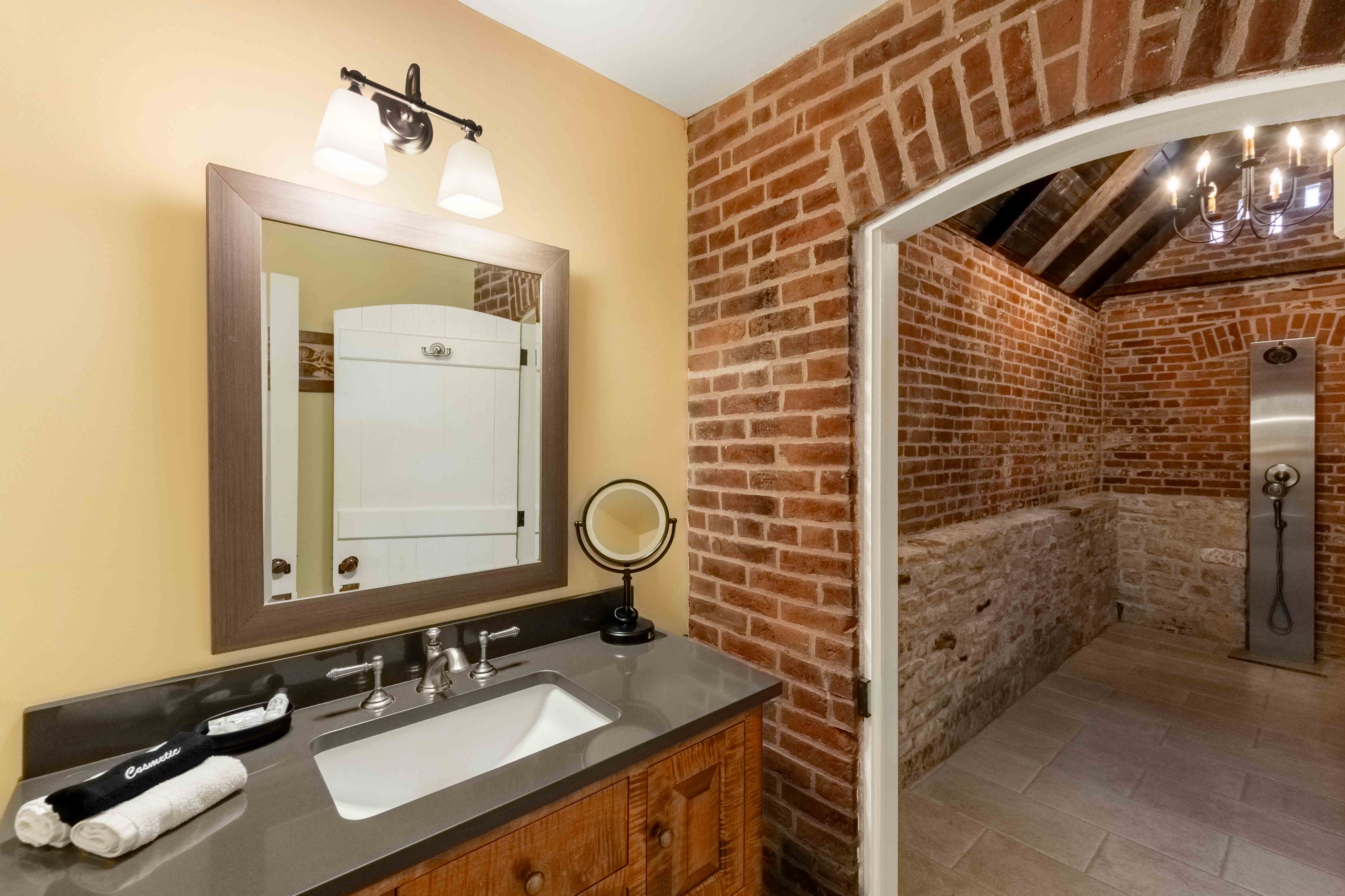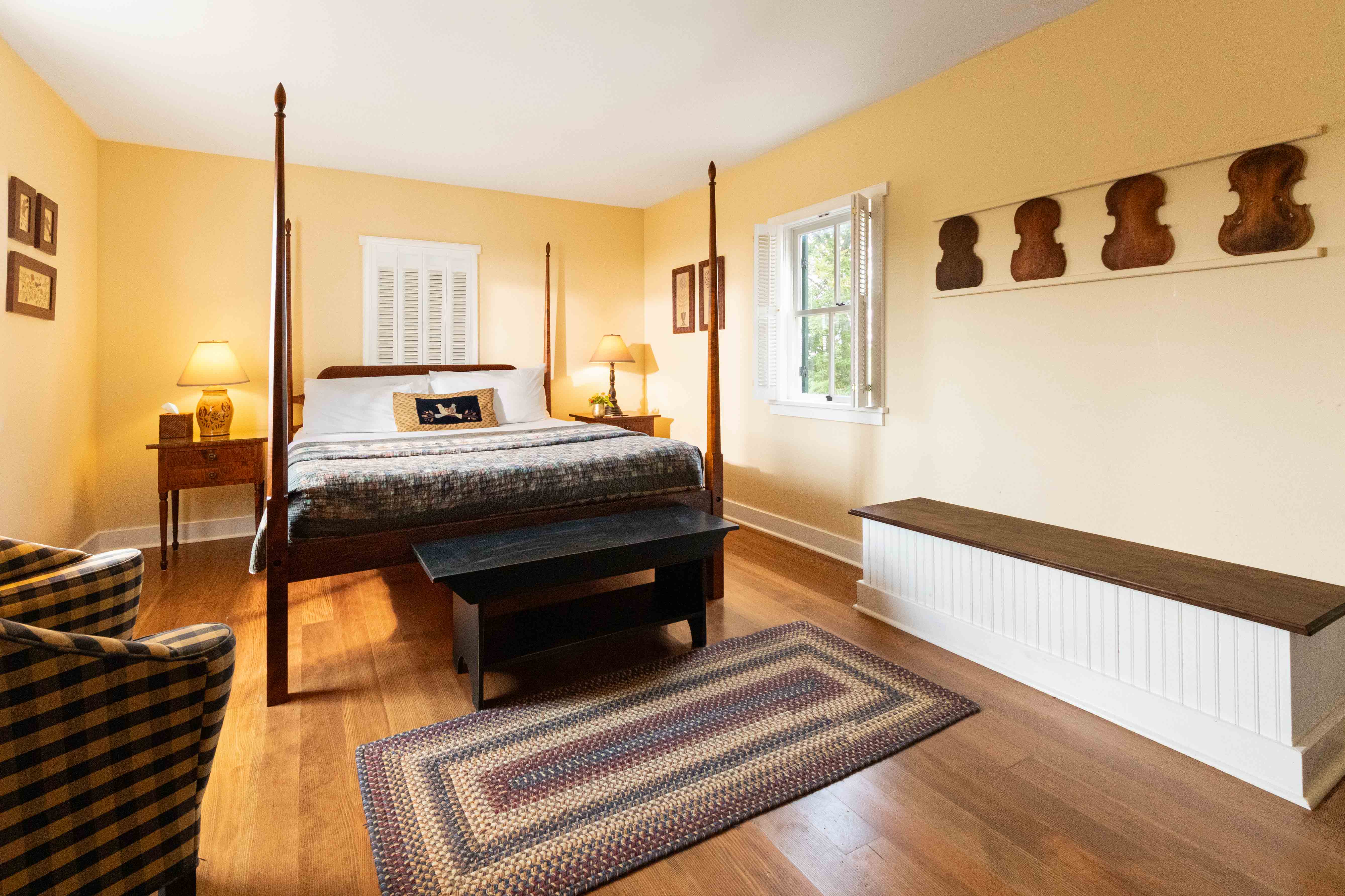 The Violin Shop at Schroeder Hill offers a very unique experience. It is a small private cottage with a one-of-a-kind stone and brick bathroom/shower. The bedroom features a king-size bed and has a *small upstairs with two built-in twin beds. The small front porch has views of the southern part of town.