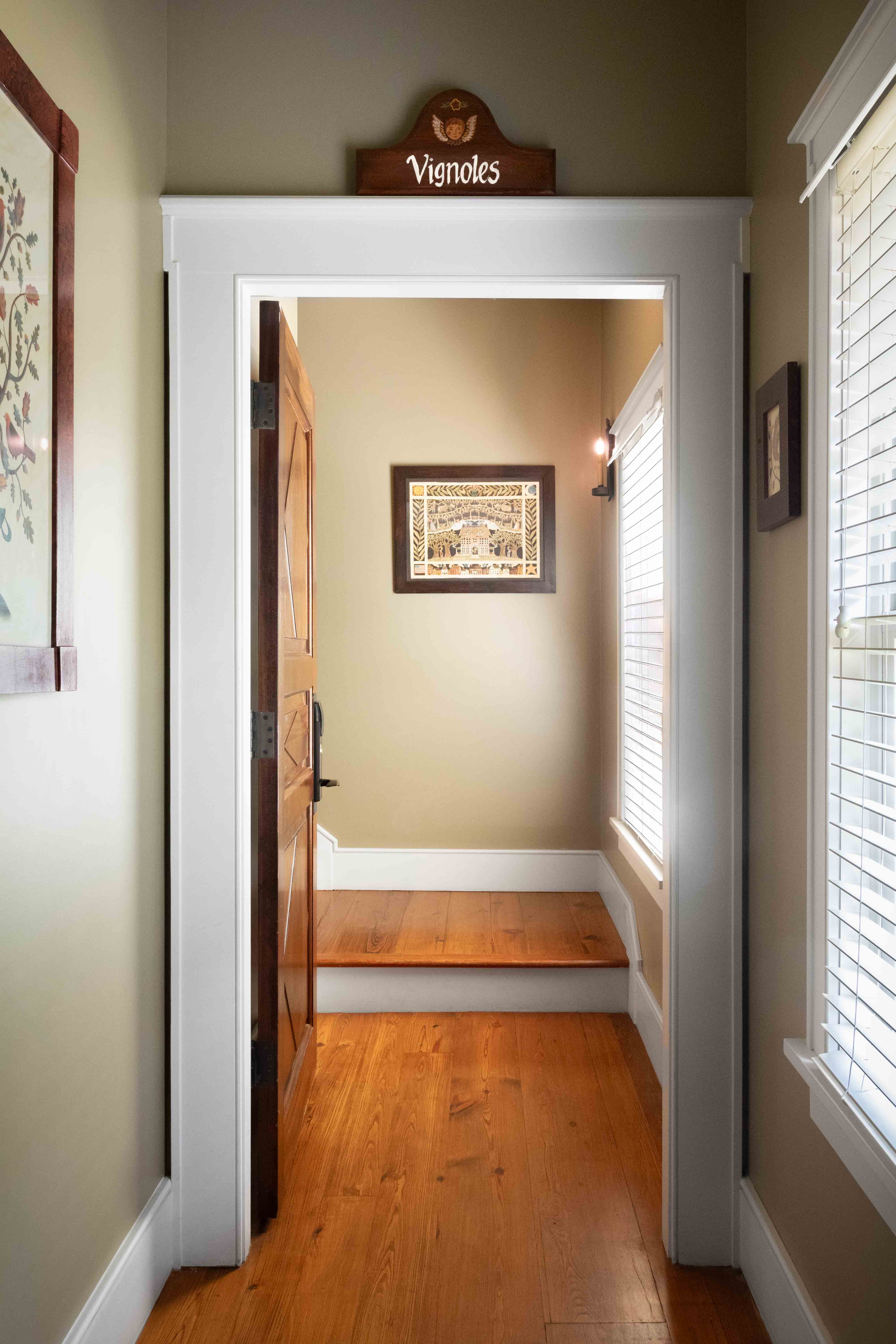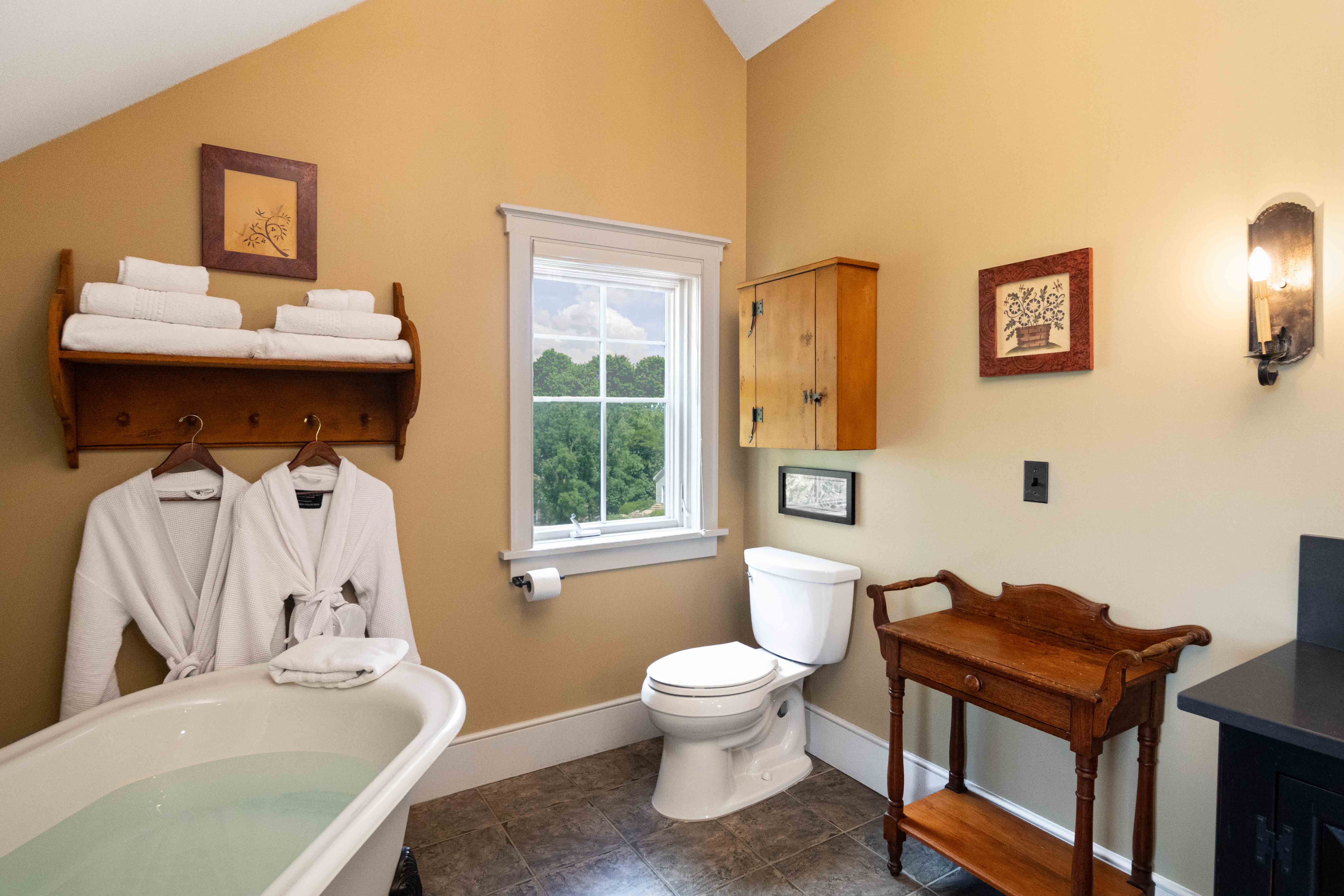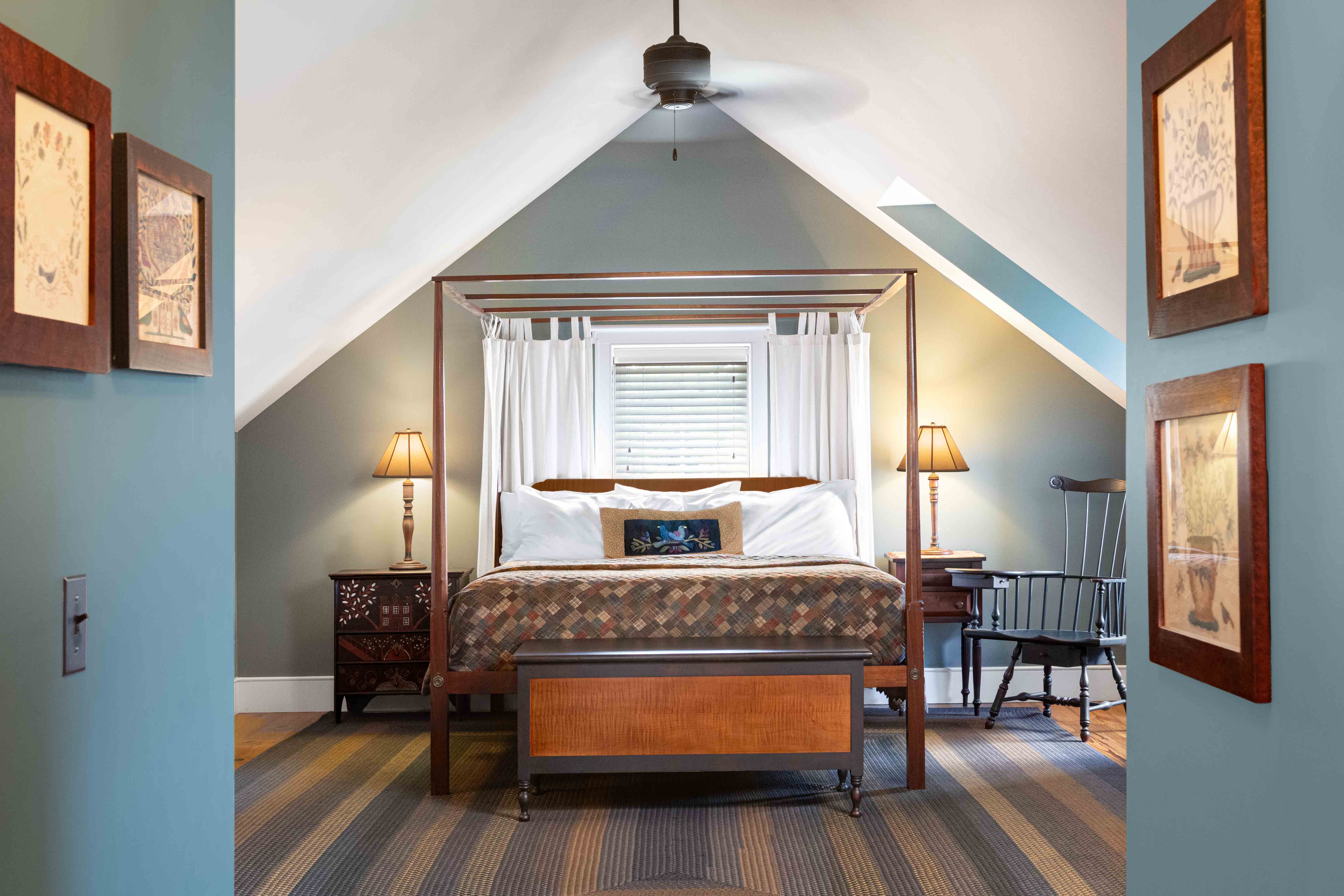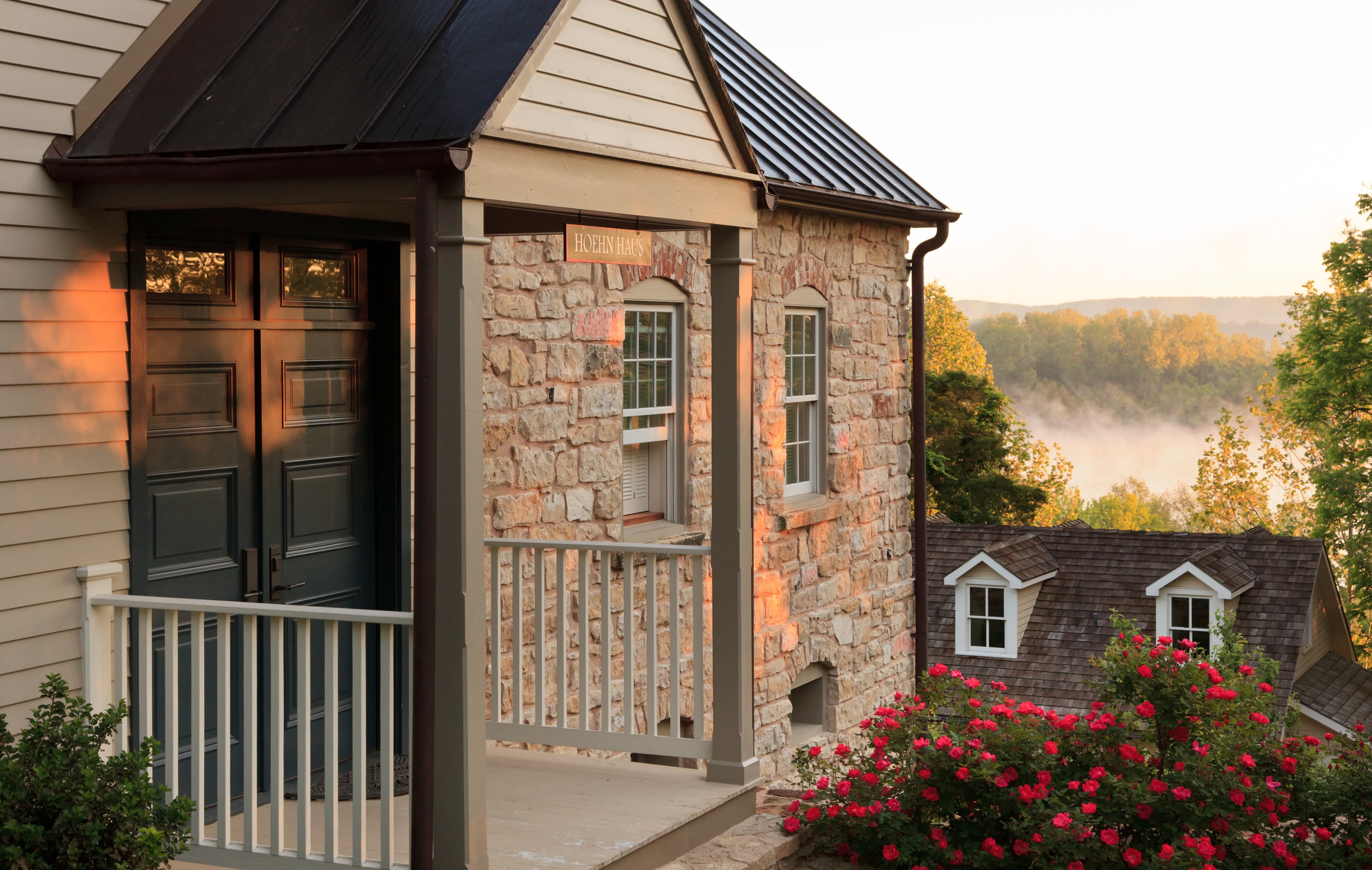 Beautifully restored, the Vignoles Suite features a king-size bed, gas stove fireplace, claw-foot tub, and walk-in shower. It is located on the upper level and requires navigating a flight of stairs. This room has incredible views of the Missouri River and the town of Hermann.