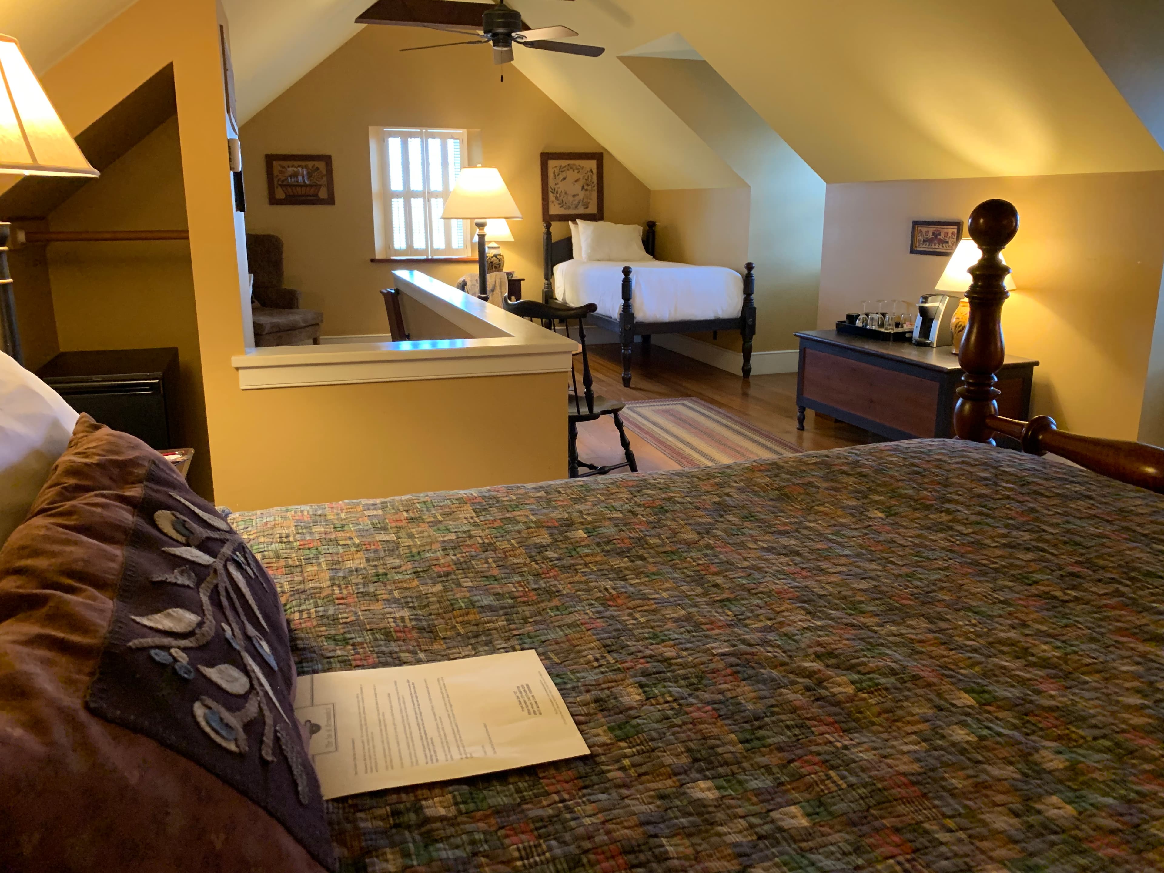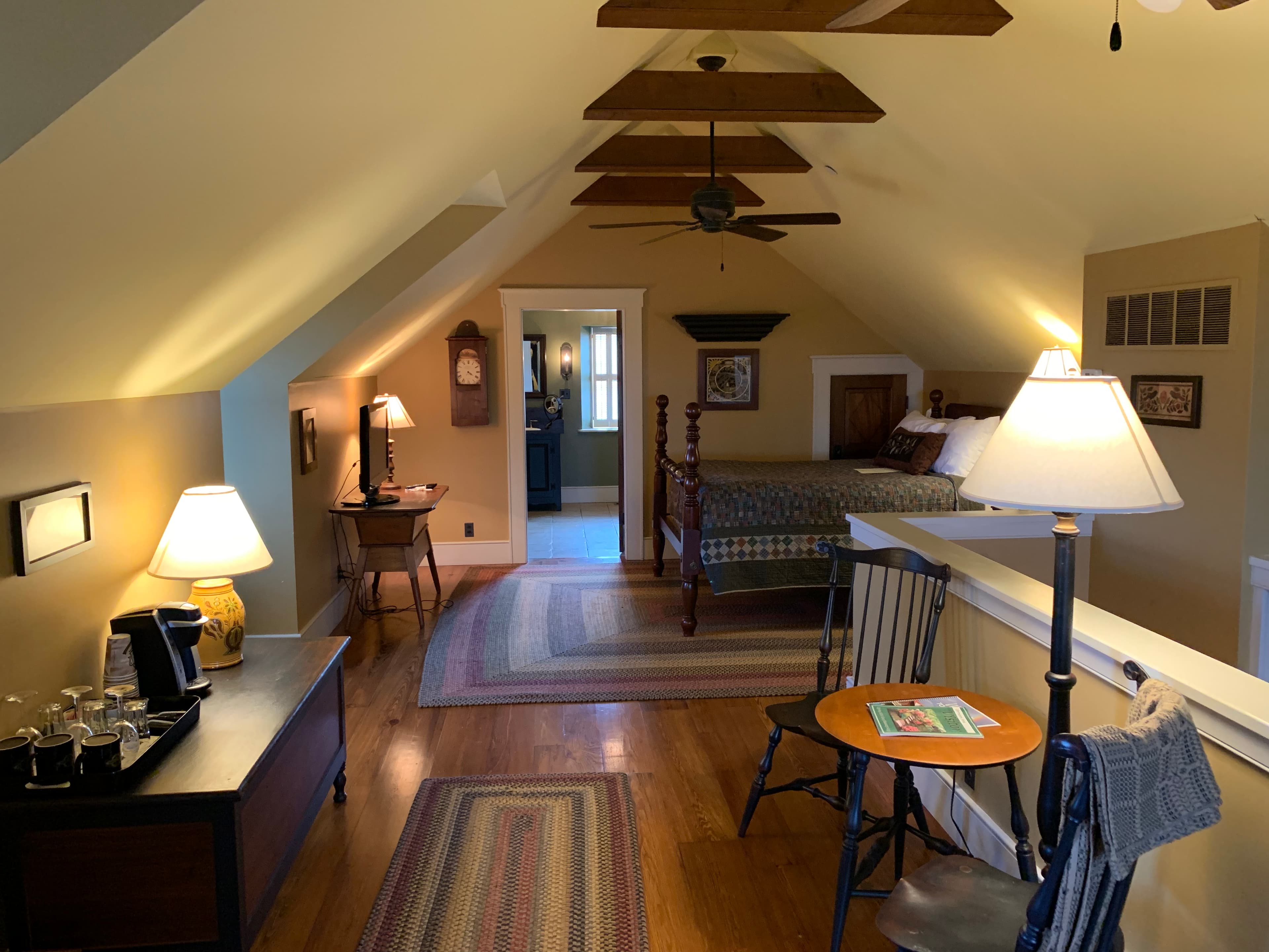 The Brahms Suite is a one-of-a-kind design, and the only suite with this distinctive floor plan. It is in the entire cellar space of the Berger Grass Haus Cottage. One of the stunning features is its flagstone floors. The suite features a California king bed, a sitting area with a gas fireplace, a separate in-suite bathroom with a claw-foot tub, a luxurious shower, and a private patio.